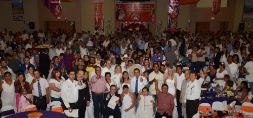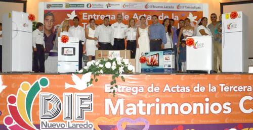 Nuevo Laredo, Tamaulipas.-El Presidente Municipal Benjamín Galván Gómez y su esposa, la señora Martha Alicia Aldapa de Galván, presidenta del Sistema DIF Nuevo Laredo, entregaron 600 actas de matrimonio a igual número parejas registradas en la Tercera Campaña Estatal de Matrimonios Colectivos que se realizó del 1 abril al 10 de mayo del 2013.