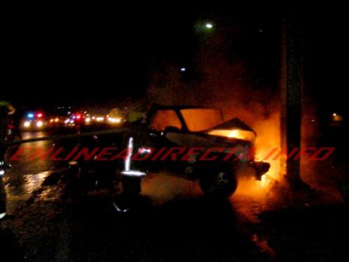 En el lugar se encontraba una camioneta que se estaba quemando siendo una Ford tipo Pick Up, modelo aproximado 2005, color blanca, con placas de circulación AC3-3654 del estado de Texas que era conducida por el señor Guadalupe Sánchez, de 75 años de edad, y quien le acompañaba su esposa Blanca González, de 72 años de edad, siendo originarios de Mission Texas a donde se dirigían.