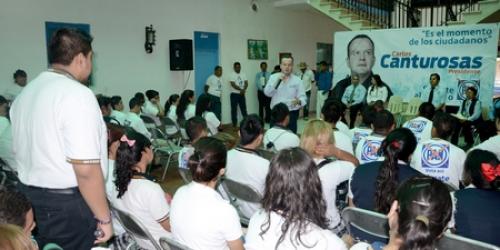Nuevo Laredo, Tamaulipas.-Durante sus actos de proselitismo político de este día, el candidato del PAN a la presidencia municipal, Carlos Cantúrosas Villarreal, tuvo un acercamiento con cerca de 200 estudiantes de preparatoria, los que le demandaron más espacios y mejores oportunidades de trabajo.