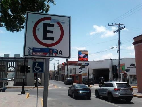 Matamoros, Tamaulipas.-Boleros de la Plaza Principal de Matamoros denunciaron que seguidores de la Candidata a Presidenta Municipal de Matamoros por el Partido Acción Nacional Leticia Salazar pegaron publicidad política en los señalamientos de vialidad lo cual obstruye la visibilidad para los automovilistas.