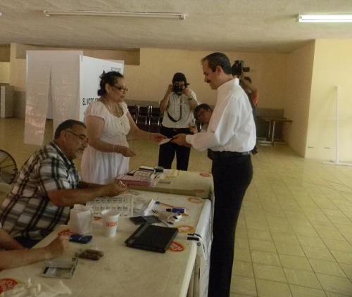 Nuevo Laredo, Tamaulipas.- A las 17:00 horas en punto, el alcalde de esta ciudad, Benjamín Galván Gómez arribó a la casilla 871, ubicada en al club El Nogal, y llegó acompañado de su esposa Martha Aldapa, para que ambos emitieran el sufragio a favor del candidato de sus preferencias.