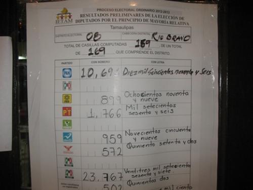 De acuerdo a datos tomados de la página del IETAM, del programa de Resultados Electorales Preliminares 2013, al llevar contabilizadas el mayor porcentaje, dieron a conocer por ejemplo: PRI 23, 093; PAN 12, 737; PT 1,969; Movimiento Ciudadano 931 y PRD 803, del 98.06%, actas totales 4382, actas capturadas 4297, avance de captura de Ayuntamientos