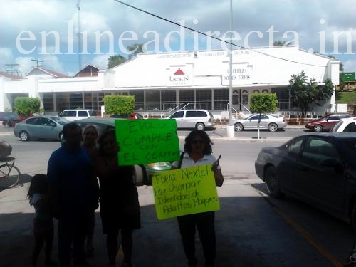 Matamoros, Tamaulipas.-Miembros de la Cámara Nacional de Comercio en Matamoros y clientes de la compañía NEXTEL, protestaron al medio día de este jueves frente a sus instalaciones que se ubican en la avenida Álvaro Obregón y Amapolas en la Colonia Jardín.