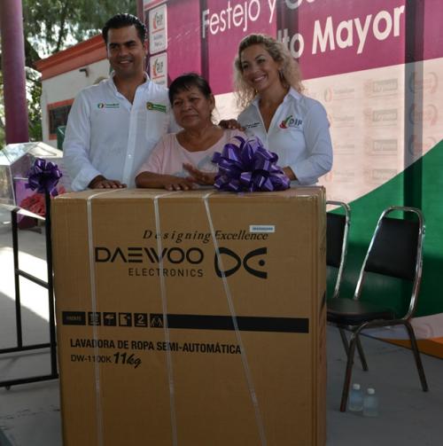 Yanira Deandar acompañada de su esposo el alcalde Everardo Villarreal Salinas, entregaron los regalos a los abuelitos, que recibieron con mucho gusto y nostalgia también, porque pasa el tiempo y cada vez son menos valorados en el seno familiar.