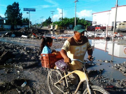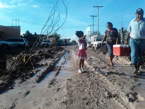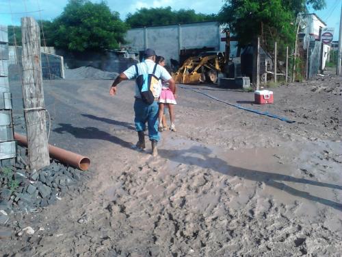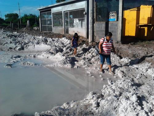 Cargando a su hija de 4 años en una mano y con la otra agarrando la oreja de la hielera donde transportan los tamales que le darán el sustento económico del día, tienen que despertarse a las cinco de la mañana, alistarse para que en punto de las 07:00 horas, emprendan su camino, mas de 2 mil 700 metros por recorrer todos los días, con el lodo hasta las rodillas y con el riesgo latente de caer a uno de los tantos pozos que la empresa constructora ha dejado a cielo abierto y que por las lluvias ahora contienen agua.