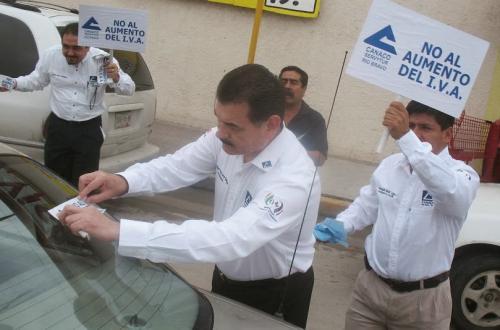 Río Bravo, Tamaulipas.– Al considerar que afectara a toda la ciudadanía el incremento al IVA, empresarios encabezados por el licenciado Miguel Garza Rodríguez, Presidente de la Cámara Nacional de Comercio (CANACO) de Río Bravo, encabezó manifestaciones de protesta en el municipio.