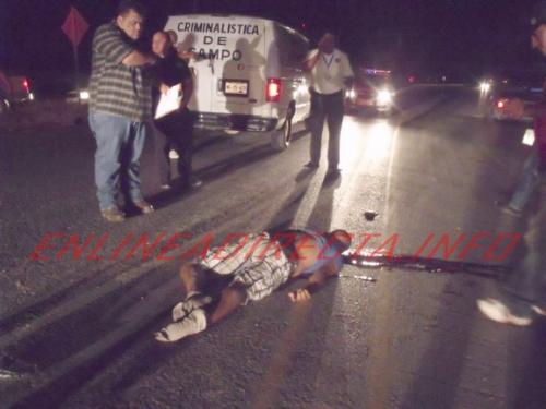 Reynosa, Tamaulipas.-Un sujeto que intento cruzar una concurrida carretera de esta ciudad, lamentablemente murió tras ser embestido brutalmente por una unidad que viajaba a exceso de velocidad y que al ver a la victima tirada huyo del lugar sin poder ser ubicado por las autoridades policiales.