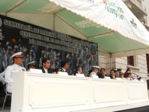 Tampico, Tamaulipas.-A pesar del frio, autoridades militares, municipales y la población, presenciaron por primera vez el desfile cívico militar que se realizó en Tampico al celebrarse hoy el Día de la Armada de México, que tiene como misión fundamental la de emplear el poder naval de la federación para la defensa exterior y seguridad interior del país, así como realizar acciones para salvaguardar la vida en la mar, mantener la soberanía y defender la integridad del territorio marítimo mexicano.