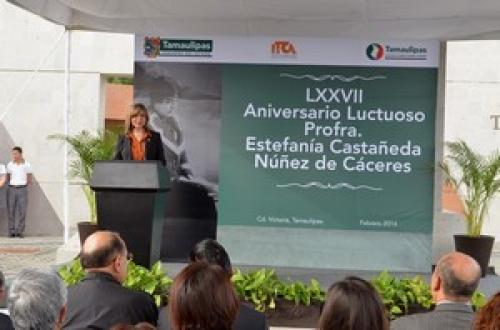 Señaló: “hoy estamos aquí para conmemorar la memoria viva de una de las mujeres más grandes que ha engendrado Tamaulipas”. Habló sobre las actividades benéficas para la educación que realizó la conmemorada tamaulipeca y agregó que, “la obra de la profesora Castañeda Núñez de Cáceres nos obliga a recordar que su herencia pedagógica sigue viva. Con su ejemplo, nuestro Gobernador Egidio Torre Cantú favorece el desarrollo integral de los Tamaulipecos, convencido que la educación es libertad y dignidad para todos”.