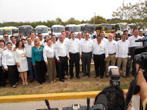 Tampico, Tamaulipas.-Autoridades de los municipios de Tampico, Madero y Altamira acompañados por el secretario de Desarrollo Urbano y Medio Ambiente del gobierno del estado, Humberto René Salinas Triviño dieron el banderazo de salida de 250 unidades del transporte público, con las cuales en total son 2 mil vehículos nuevos con los que se cuenta de enero del 2013 a la fecha, en el marco de la modernización del transporte.