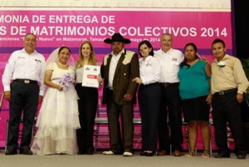MATAMOROS, Tamaulipas.- Con el objetivo de proporcionar legitimidad y seguridad a las parejas que desean formalizar su compromiso, el Sistema DIF Tamaulipas que preside María del Pilar González de Torre, concluyo la Campaña Estatal de Matrimonios Colectivos en los 43 municipios del Estado en coordinación con la Secretaria del Trabajo y Asuntos Jurídicos del Gobierno del Estado, mediante las oficialías del Registro Civil y los DIF Municipales.