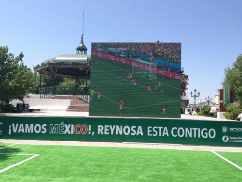 Reynosa, Tamaulipas.-El Ayuntamiento de Reynosa instaló una mega pantalla en la explanada de la Plaza Principal frente a Palacio Municipal, en donde se hará la transmisión de los juegos de la selección nacional de México en su participacion en el Mundial de Futbol Brasil 2014.