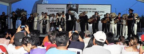 Familias de las colonias populares, comunidades rurales del Valle de Texas ovacionaron, en la Expo “Fuerzas Armadas y Sociedad Civil, Unidos por los Valores en Tamaulipas”, el ensamble de mariachis de la Secretaría de Marina, Dragones de la Policía Federal y el del Instituto Reynosense para la Cultura y las Artes que tocaron y cantaron ante los aplausos y gritos de “otra, otra, otra”. La exhibición es un logro dado gracias a la suma de esfuerzos del Gobernador Egidio Torre Cantú, el Alcalde Pepe Elías Leal, el Almirante Pedro García Valerio, Comandante de la 1ª Región Naval; el General de Brigada DEM; Pedro Felipe Gurrola Ramírez, Comandante de la 8ª. Zona Militar; el Lic. Francisco Martín Camberos Hernández, Delegado Estatal de la PGR en Tamaulipas y el Lic. Salvador Camacho Aguirre, Jefe de la División de Fuerzas Federales de la Policía Federal.