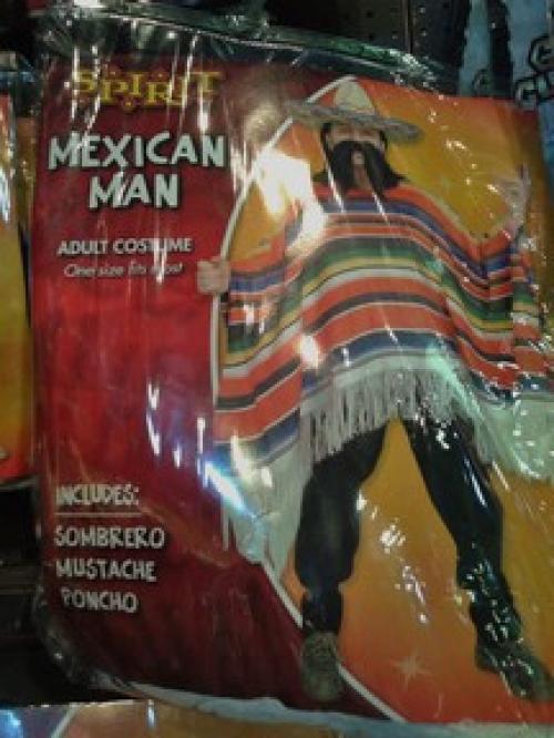 Se trata del disfraz de “Mexican Man”, el cual por 29 dólares (375 pesos) se puede ataviar como “mexicano” con un sombrero, “mostacho” (bigote) y un “poncho” (sarape). Desde esa perspectiva se tiene estigmatizado a los mexicanos.