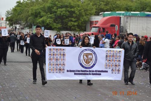 Casi a la mitad del desfile, a las 10:30 horas, un grupo de jóvenes se apostaron en la acera frontal del templete donde los funcionarios observaban a los contingentes, por lo que levantaron algunas cartulinas aludiendo a los 43 normalistas desparecidos en la escuela normal de Ayotzinapa, en Guerrero.