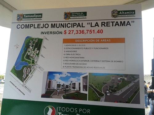 Altamira, Tamaulipas.- Con un monto superior a los 27 millones de pesos se dio arranque a la construcción del edificio de gobierno La Retama que albergará las secretarías del ayuntamiento de Altamira. En un evento desarrollado a un costado del fraccionamiento Corredor Industrial sobre la calle séptima, el gobernador Egidio Torre Cantú junto con el alcalde Armando López Flores colocaron la primera piedra de lo que será el moderno complejo administrativo.