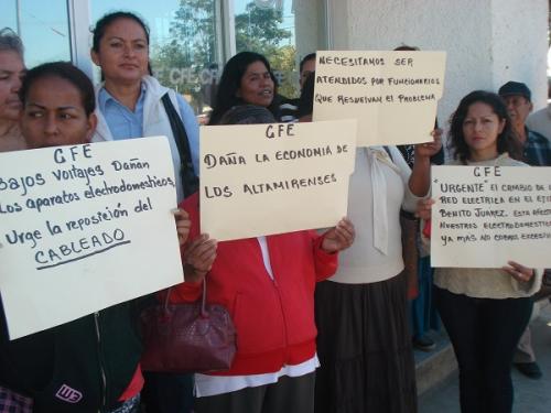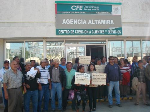 Altamira, Tamaulipas.- Un grupo de por lo menos 30 habitantes del ejido Benito Juárez de Altamira con cartulinas en mano se manifestaron a las afueras las oficinas de la comisión federal de electricidad debido al pésimo servicio que presta en aquella zona del municipio.