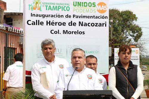 El trabajo en equipo con la suma de voluntades alineadas en la política social de los gobiernos federal, estatal y municipal, permite al Ayuntamiento de Tampico seguir avanzado en materia de pavimentación, aseguró el alcalde Gustavo Torres Salinas al inaugurar la pavimentación de la calle Héroe de Nacozari en la colonia Morelos.