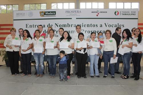 Madero, Tamaulipas.- Con el compromiso de elevar la calidad de vida de la población, se llevó a cabo la entrega de nombramientos a vocales del programa “PROSPERA”, que los acredita para promover el mejoramiento de la educación y alimentación de más de 4 mil beneficiarios que cuentan con los apoyos que proporciona el Gobierno Federal.