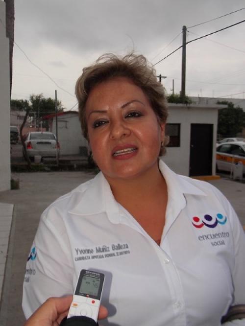 Reynosa, Tamaulipas.-La candidata a la diputación federal por el Distrito II en Reynosa por el Partido Encuentro Social, Yvonne Muñiz Balleza, expuso que su campaña la ha dirigido en forma personalizada a cada ciudadano, llevando a sus manos sus propuestas legislativas y haciendo un compromiso de dignificar la representación legislativa en el Congreso de la Unión.