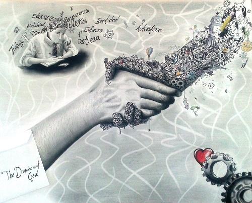 El dibujo es algo complejo, y se trata de una mano humana que estrecha a otra mano mecánica, formada por partes tecnológicas, pero también por personas representadas por la familia, amigos, maestros y valores de Kevin.