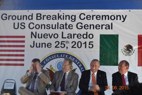 Luego de terminar el evento informativo, el embajador de Estados Unidos, así como los gobernadores de Tamaulipas y de Coahuila, el cónsul norteamericano en Nuevo Laredo y el alcalde de esta ciudad, tomaron una pala, y con ella ‘colocaron’ de manera simbólica la primera piedra del edificio consular.