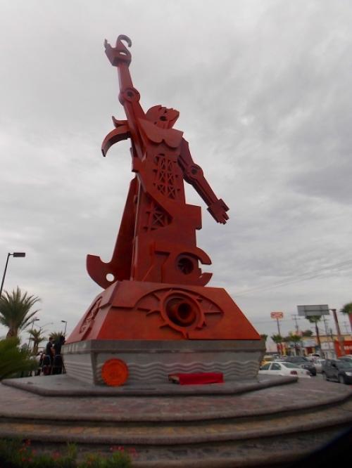 El concepto escultórico tiene como elemento principal la figura de una mujer que puede representar a la industria a la región y a la patria, esta cimentada en una pirámide truncada que por sus cuatro lados narra las técnicas en la explotación de los recursos naturales.