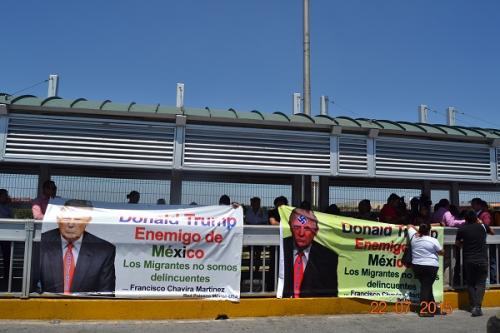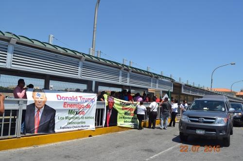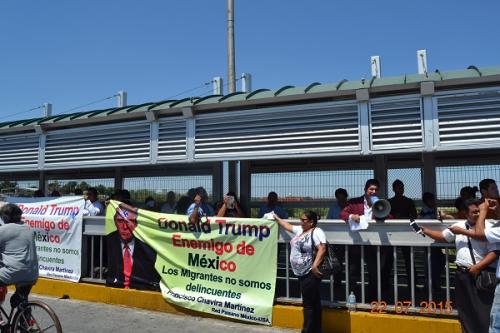 Nuevo Laredo, Tamaulipas.- Decenas de manifestantes mexicanos protestaron a la mitad del puente internacional uno de esta frontera, en contra de la visita que hizo la tarde de este jueves el candidato presidencial Donald Trump, postulado por el partido Republicano en Estados Unidos.