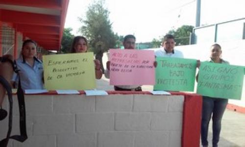 Linda Adriana Martínez, Jorge Alberto Flores Ruiz, Sandra González Lucio y Elier Díaz, apoyados por otra maestra se manifestaron y exigen a la Secretaría de Educación Pública que les resuelva esta problemática, ya que no es justo que la directora Nora Elisa González esté actuando de esta manera.