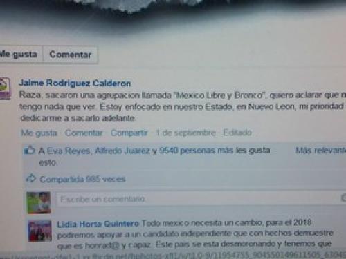 Reynosa Tamps..El gobernador electo de Nuevo León Jaime Rodríguez Calderón “El Bronco” se deslindó de la agrupación “México Libre y Bronco” que en algunas ciudades del país se ha conformado con la pretensión de “asesorar y apoyar” a quienes pretendan aspirar a cargos de representación popular en forma independiente.