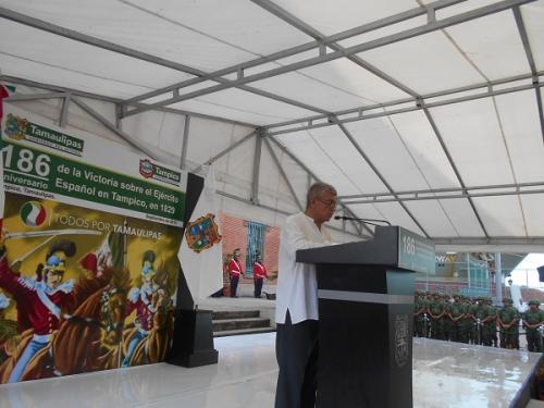 En el evento que se realizó hoy a las 10:20 horas en la explanada del ex edificio de la Aduana de Tampico, con la asistencia de funcionarios federales, estatales y municipales, el mandatario estatal afirmó:“Hoy es un día de fiesta nacional que nos llena de orgullo a todos los tamaulipecos, rendimos homenaje a los que forjaron el rostro de la patria mexicana, a los que le dieron esencia y rumbo al Tamaulipas, celebramos un aniversario más de la victoria del puerto de Tampico y del ejército mexicano en el último intento de reconquista de la corona española”.