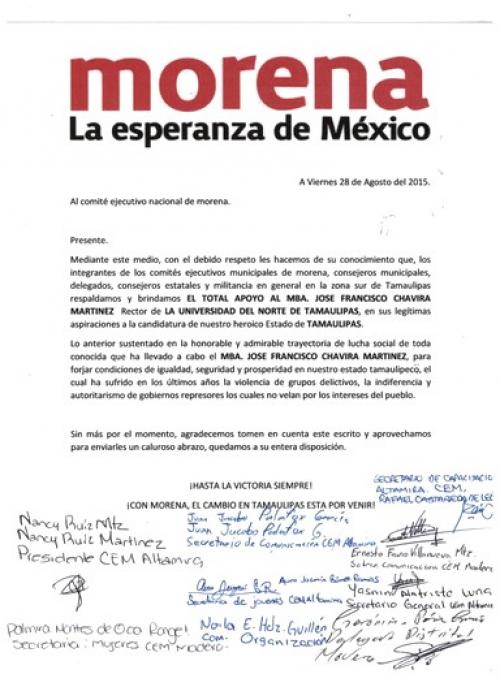 Mediante un comunicado que hicieron llegar a medios de comunicación informaron que en una reunión de dirigentes de diferentes municipios se llegó al acuerdo de quien los podría representar en estas prontas elecciones del 2016 para la gubernatura del estado y recayó en el nombre de Francisco Chavira Martínez y quien ha luchado siempre por una verdadera izquierda y sin compromisos de índole alguna, se decidieron en apoyarlo al 100% si era el abanderado por el partido MORENA su partido.