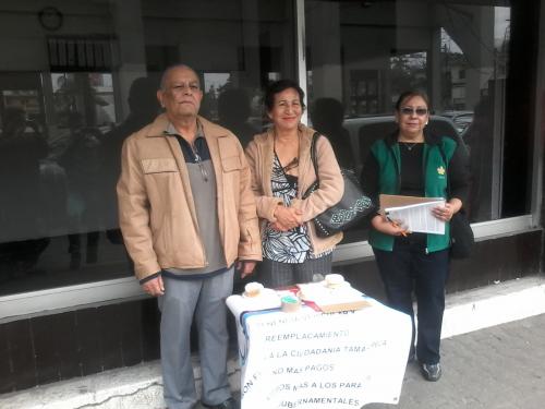 Madero, Tamaulipas.-Un grupo de ciudadanos lleva a cabo la recolección de firmas de la población como parte de las acciones para gestionar la derogación de la tenencia vehicular en Tamaulipas, actividad que realizan en un modulo instalado afuera del sindicato petrolero.