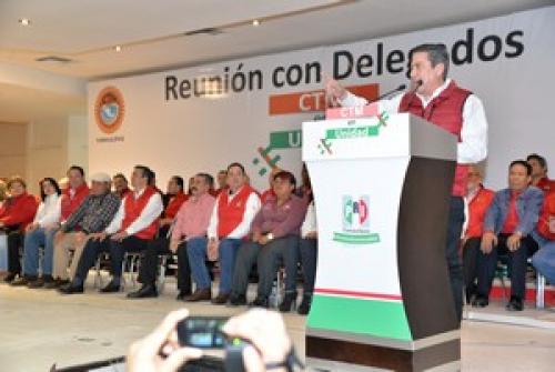 Hoy con todo el presídium que el día de hoy nos acompañan creo que es digno de saludar por que se encuentra aquí la gran representación de ustedes, de los más de 30 mil trabajadores de Nuevo Laredo que hoy están representados por los 43 dirigentes de los diferentes sindicatos que forman parte de la CTM que les pido que se pongan de pie, vamos a darle un fuerte aplauso, la gran representación de priistas que hoy nos acompañan, gracias de verdad por estar aquí.