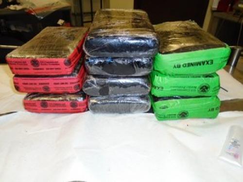Al momento de iniciar la inspección física al remolque y su carga con el apoyo de un perro adiestrado, fueron descubiertos 121 paquetes que ocultaban en total77 kilos y medio de cocaína, y 57 kilos de heroína, todo con un valor estimado por los expertos, en 4 millones 182 mil 600 dólares.