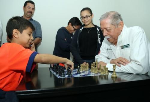En la gráfica, el mandatario tamaulipeco juega una partida de ajedrez junto a uno de los niños promesa del “deporte ciencia” tamaulipeco, en los recién inaugurados salones del Polideportivo de Reynosa, destinados para la práctica de esta disciplina, dentro de su gira de trabajo por la franja fronteriza norte de la entidad.