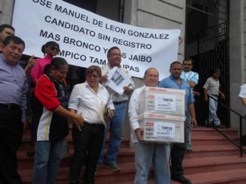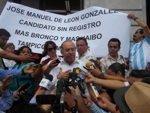 Tampico, Tamaulipas.-Al no recibir respuesta del Instituto Electoral de Tamaulipas, José Manuel de León González, aspirante independiente a la alcaldía de Tampico, se manifestó este día con pancarta en mano y afirmó que decidió ser un candidato sin registro, más bronco y más jaibo, ya que dijo no es justa la postura de esa autoridad y por es no bajará la guardia, sin embargo afirmó que no se encadenará ni hará desmanes como lo está haciendo el que busca la presidencia de Altamira.