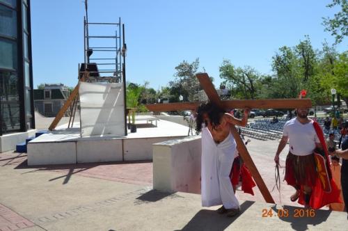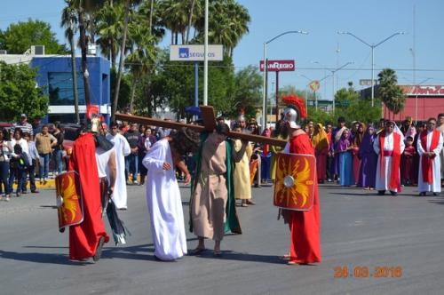 Nuevo Laredo, Tamaulipas.-Desde que inició la presente administración, la Diócesis de Nuevo Laredo realiza la Pasión y Muerte de Jesús a través del Vía Crucis, representación que inició cerca de las 10:00 horas en la plaza Esteban Baca Calderón, para terminar en la catedral del Espíritu Santo, luego de una marcha por la avenida Guerrero.