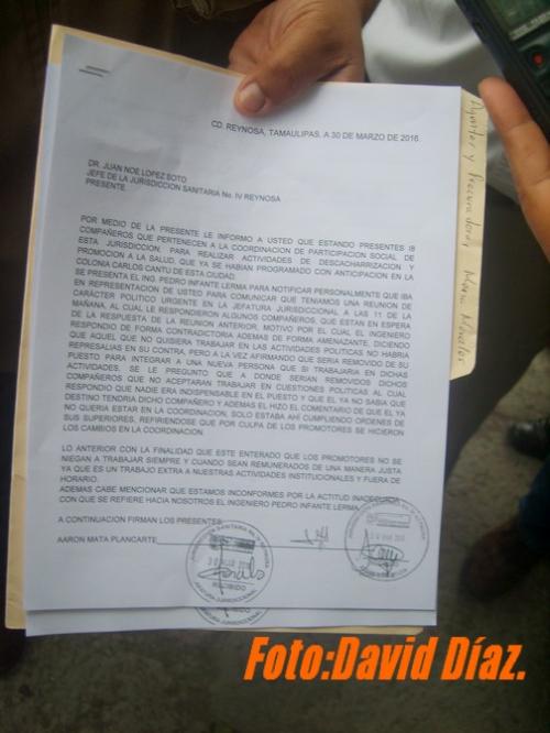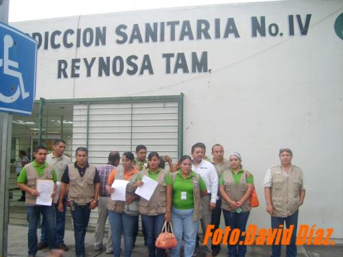 Reynosa, Tamaulipas.-Un grupo de trabajadores pertenecientes a la Cuarta Jurisdicción Sanitaria Número 4, realizaron una protesta pacífica, ya que acusan al titular y a un empleado de ese centro de servicio a la salud de condicionar su trabajo y hacerlos trabajar a favor de un partido político.