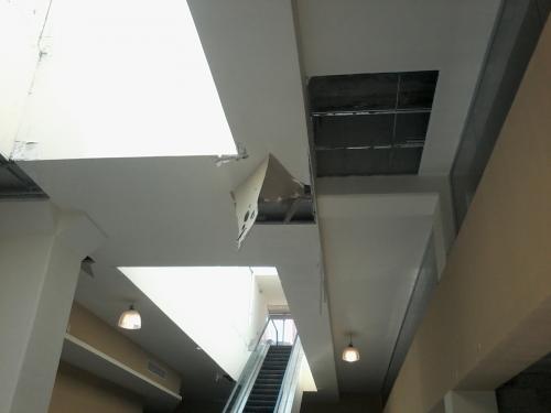 Dijo que es tabla roca la que se utilizó para los niveles asignados para los locales comerciales, y partes de este se encuentran colgando de los techos, así como también de las paredes.