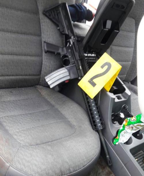 Del interior de la camioneta se aseguró un arma larga con su respectivo cargador, seis cartuchos útiles de alto calibre, un teléfono celular y un radio de comunicación, entre otros objetos.