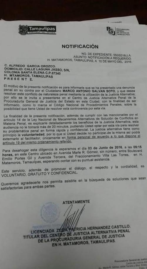 De acuerdo al número de expediente 550/2016/J.A. con fecha 10 de Mayo, presentado ante la licenciada Zeida Patricia Hernández Castillo quien es Titular del Centro de Justicia alternativa Penal de la Procuraduría General de Justicia en Matamoros, Tamaulipas, se expone el motivo y le notifican al Ciudadano Alfredo García Orozco con domicilio en la calle Laguna Jasso Sin Numero de la Colonia Santa Elena, quien funge como Director de la Primaria Carolina Sosa González de tiempo completo, y principal promotor de las actividades para destituir al profesor Galván Soto.