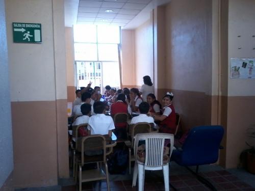 Debido a esta situación, los alumnos de diversos grupos sacaros sus mesabancos y en los pasillos y el patio central de la escuela toman sus clases.