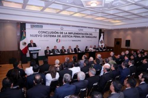 CD. VICTORIA, Tamaulipas.-Con cinco días de anticipación, el gobierno de Egidio Torre Cantú concluyó la implementación del Nuevo Sistema de Justicia Penal Acusatorio y Oral en Tamaulipas a través de 15 Distritos Judiciales, modelo que se aplicará a partir del 18 de junio en todo el país.