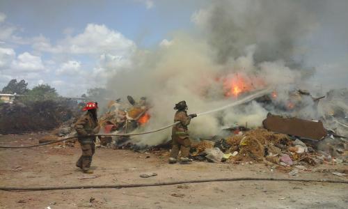 Matamoros, Tamps.-El incendio de las cuatrocientas toneladas de basura que hasta el momento sigue que fue provocado, aún siguen siendo apagadas por elementos del Heroico Cuerpo de Bomberos quienes han trabajado más de 24 horas, por controlar el fuego el cual se salió de control en la tarde del pasado jueves.