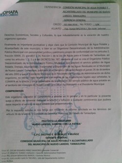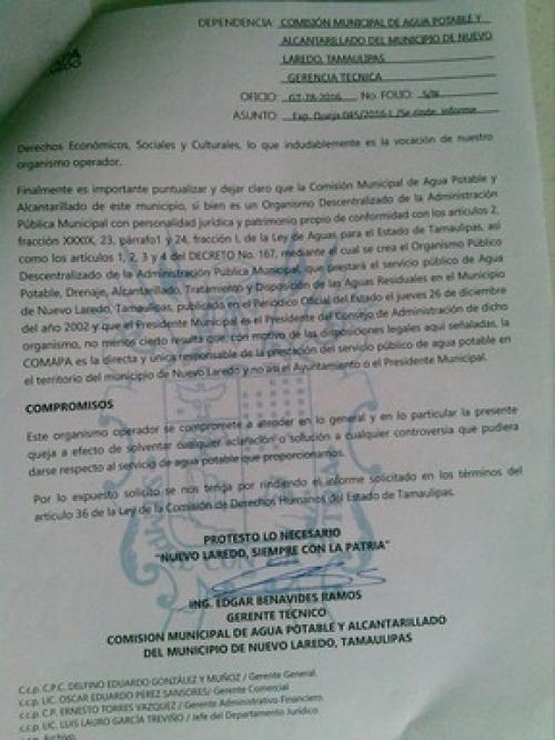 La queja se presentó contra la Comapa y el presidente municipal Carlos Canturosas, por ser el presidente del Consejo de Administración de ese organismo, sin embargo, en la contestación realizada a la delegación regional de derechos humanos, el alcalde se deslinda del compromiso, y deja a la directiva de la empresa la resolución de este asunto.