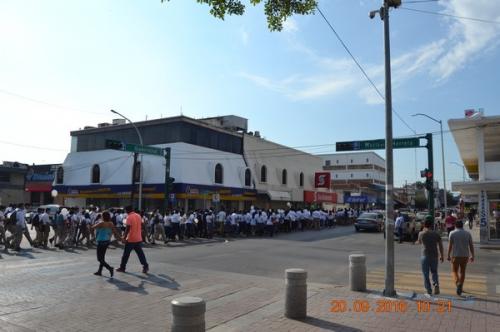 Nuevo Laredo, Tamaulipas.-Una caminata promovida por la Diócesis de Nuevo Laredo, en la que participaron cerca de 300 estudiantes, se dirigió desde la plaza Esteban Baca Calderón, por la avenida Guerrero, hasta la catedral del Espíritu Santo, en donde el obispo Enrique Sánchez Martínez ofició una misa.