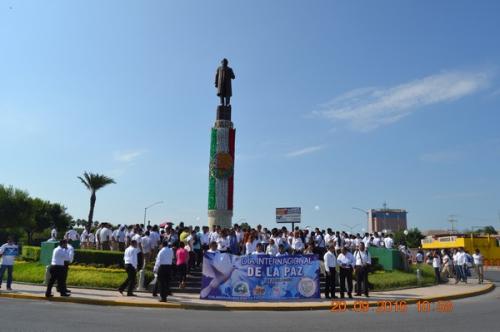 Ante de arribar a la catedral, el grupo se detuvo unos momentos en el monumento a Benito Juárez, y bajo el mismo silencio, se tomaron algunas fotografías para después reiniciar la caminata, siempre en silencio y con globos blancos en sus manos.