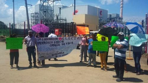 Altamira, Tamaulipas.-Familias que radican en la periferia de la empresa Chemours en la colonia Miramar de Altamira protestaron a las afueras en uno de los accesos por los serios problemas de salud entre la población mientras se desarrollaba la inauguración de la línea de producción esta mañana de jueves.