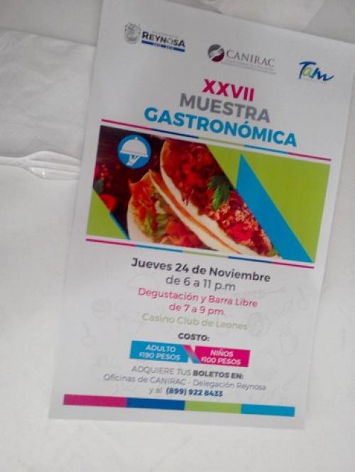En conferencia de prensa dieron a conocer que el Ayuntamiento de Reynosa, que preside la doctora Maki Ortiz Domínguez, en coordinación con la Canirac estarán realizando el día jueves 24 de Noviembre del presente año que se realiza la XXVII gastronómica, misma que será en el conocido casino del Club de Leones, ubicado en la colonia Doctores, así lo dio a conocer Alfonso De León Fuentes, representante de la Cámara Restaurantera y Condimentos de Reynosa.